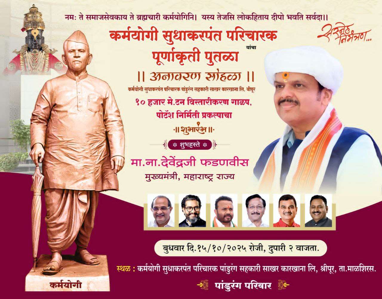 पंढरपूर/ज्ञानप्रवाह न्यूज,दि.१५/१०/२०२५- कर्मयोगी सुधाकरपंत परिचारक पांडुरंग सहकारी साखर कारखाना लि,श्रीपूर येथे कर्मयोगी सुधाकरपंत परिचारक यांचा पुर्णाकृती पुतळा अनावरण सोहळा आणि १० हजार मे.टन विस्तारीकरण गाळप, पोटॅश निर्मिती प्रकल्पाचा शुभारंभ बुधवार दि.१५/१०/२०२५ रोजी दुपारी २.३० वाजता होणार आहे.