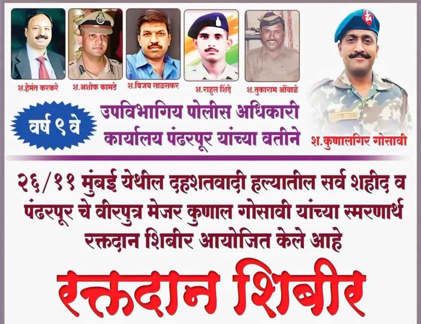 पंढरपूर/ज्ञानप्रवाह न्यूज — देशासाठी आपले प्राण अर्पण करणाऱ्या 26/11 मुंबई दहशतवादी हल्ल्यातील सर्व शहीदांच्या स्मरणार्थ पंढरपूर उपविभागीय पोलीस अधिकारी कार्यालयाच्या वतीने भव्य रक्तदान शिबिराचे आयोजन करण्यात आले आहे.या हल्ल्यात शहीद झालेले श.हेमंत करकरे,श.अशोक कामठे, श.विजय साळसकर,श.राहुल शिंदे,श. तुकाराम ओंबाळे तसेच पंढरपूरचे वीरपुत्र श.मेजर कुणाल गोसावी यांना अभिवादन म्हणून हा विशेष उपक्रम राबविण्यात येत आहे. देशासाठी बलिदान दिलेल्या प्रत्येक वीराला सलाम करण्याचा हा एक प्रेरणादायी आणि जनजागृती करणारा उपक्रम ठरत आहे.रक्तदान शिबिर दि.26 नोव्हेंबर 2025 रोजी सकाळी 9 ते सायं. 5 या वेळेत रखुमाई सभागृह (पोलीस संकुल), पंढरपूर येथे होणार आहे.